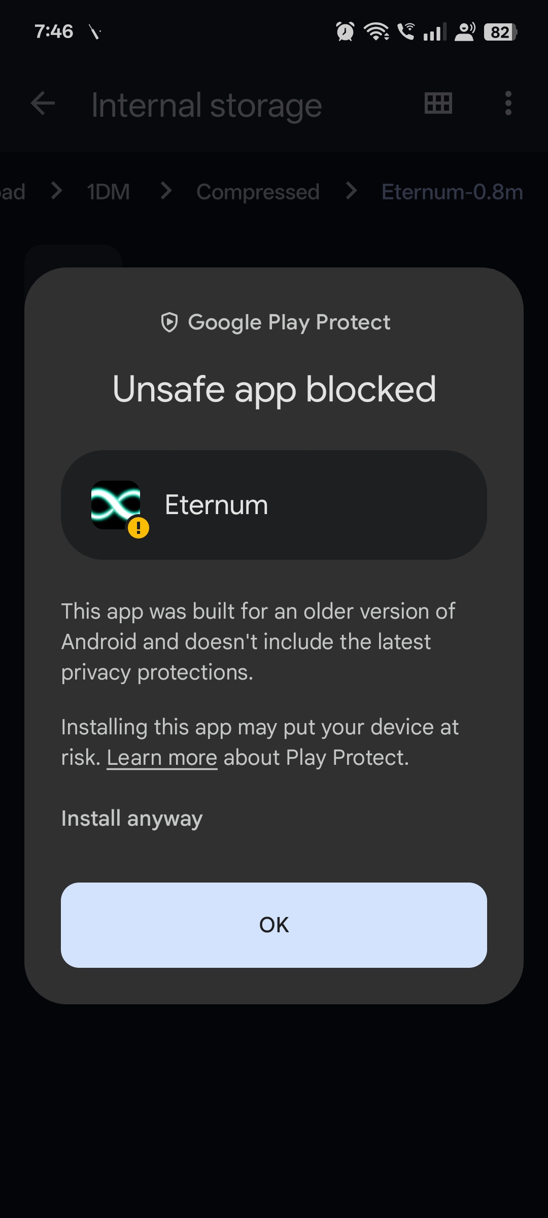 I tried to install Eternum 0.7v, but all the times i put on to download the .apk he dont install, say a mesage "the app was not installed", I thought it was a lack of memory, So I freed up 27GB and it still didn't install, I even downloaded version 0.6 and everything was normal. Please help, i been waitign this version a long time